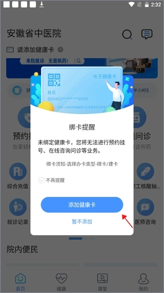 1、进入软件首页就会自动弹出一个窗口,需要绑定健康卡才能办理一些业务,点击“添加健康卡”。