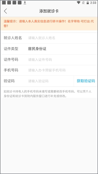 4、填写就诊人的基本信息和预留手机号,验证通过后就绑定成功了。