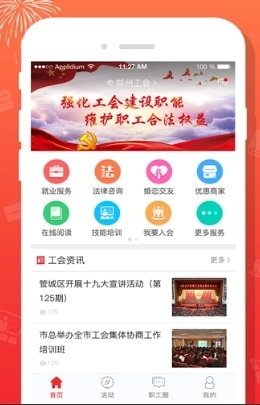 目前,该平台有就业服务、婚恋交友、技能培训、法律咨询、入会转会、困难申请、安全隐患、优惠商家、在线阅读等服务模块,还有工会资讯和工会活动等内容。