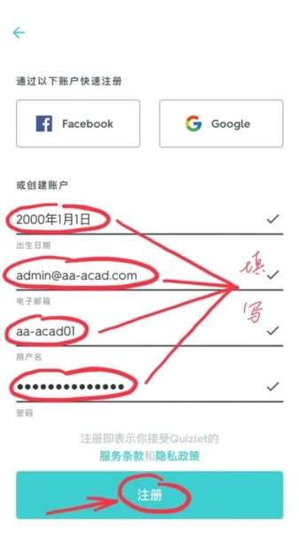 ●Quizlet将为您自动创建用户名。别担心,您可在注册后更改它!