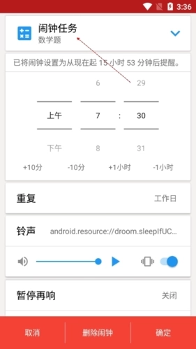 使命闹钟支持用户设置数学题目,借助解题过程帮助自己更顺利地清醒过来,达到提神醒脑的效果。通过完成这些数学题目,能让大脑快速恢复清晰思绪,摆脱刚醒来时的茫然状态,真正实现一个闹钟应有的功能。对于还不熟悉设置方法的用户,可以尝试参考下方的步骤进行操作。