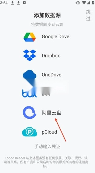 1、登录Koodo Reader app后可以选择添加云盘数据源,不添加可以直接跳过