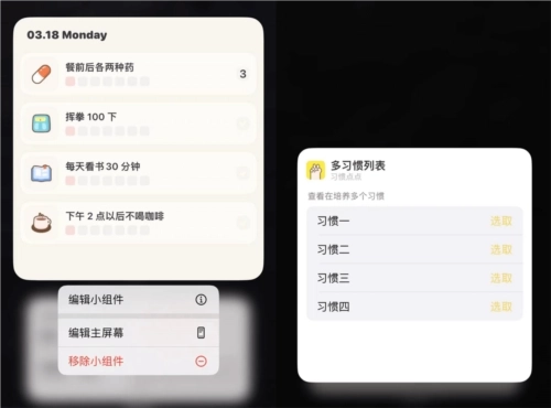 习惯、奖励类小组件,都能通过长按小组件并选择「编辑小组件」,来配置需要展示的习惯或奖励内容。