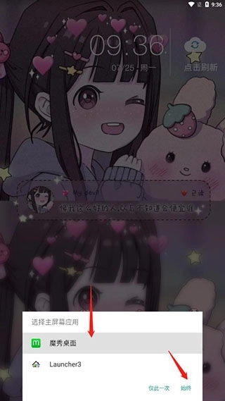 3、选择魔秀桌面,接着点击下方的“始终”按钮,这样就能将其设置为默认的永久桌面了。