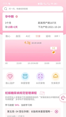 【孕期健康】平台还配备了孕期胎心监护、孕期体重管理、血压监测、食物库、AI识别食物成分等贴心实用的功能。