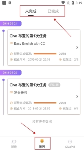 4、接着在【拓展】界面里,就能查看自己之前练习或完成任务的全部信息。