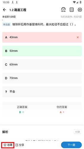 4、进入做题,当你做错题目时,点击左下方的收藏即可收藏错题。