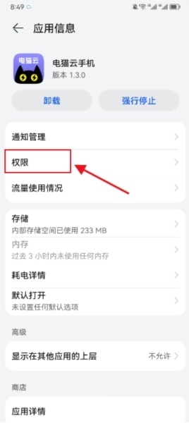 1、打开手机设置,进入应用管理页面,找到电猫云手机应用,进入其权限设置界面,开启相机、麦克风和位置权限。