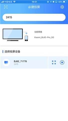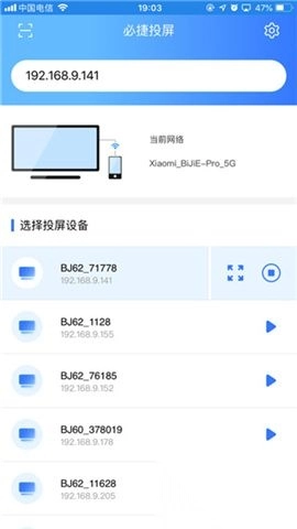 接下来把安卓手机和必捷投屏接收端设备连接到同一个局域网。