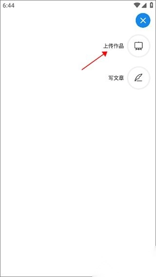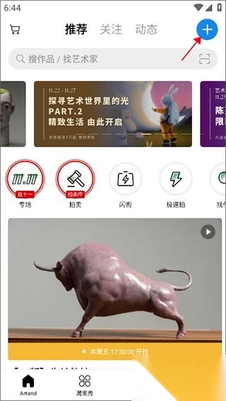 1、首先在手机上打开并登入Artand,进入主页后点击右上角的蓝色加号按钮进入作品发布环节