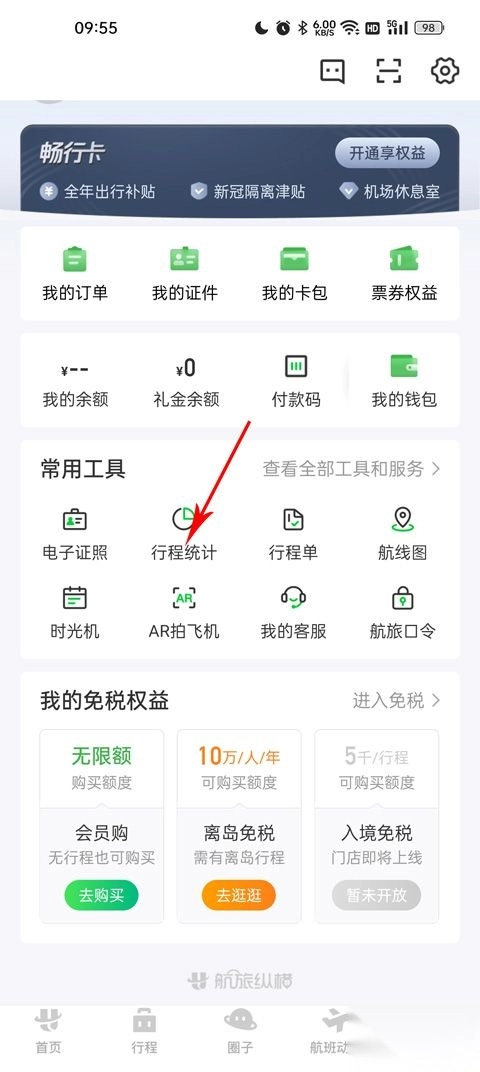 进入我的页面后,在中间区域的常用工具板块里找到行程统计功能,点击即可进入。
