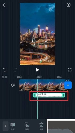 用户选中视频下方的音频后,可对音频进行分割操作,以此控制音频在视频里的起始与结束时间;右下方的音量图标能调节音频在视频中的音量大小,此外还有音频淡入淡出效果可供选用。