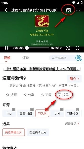 然后就会进入播放页面,此时可以点击右上角的“TV”按钮,也可以选择点击中间的“投屏”按钮。