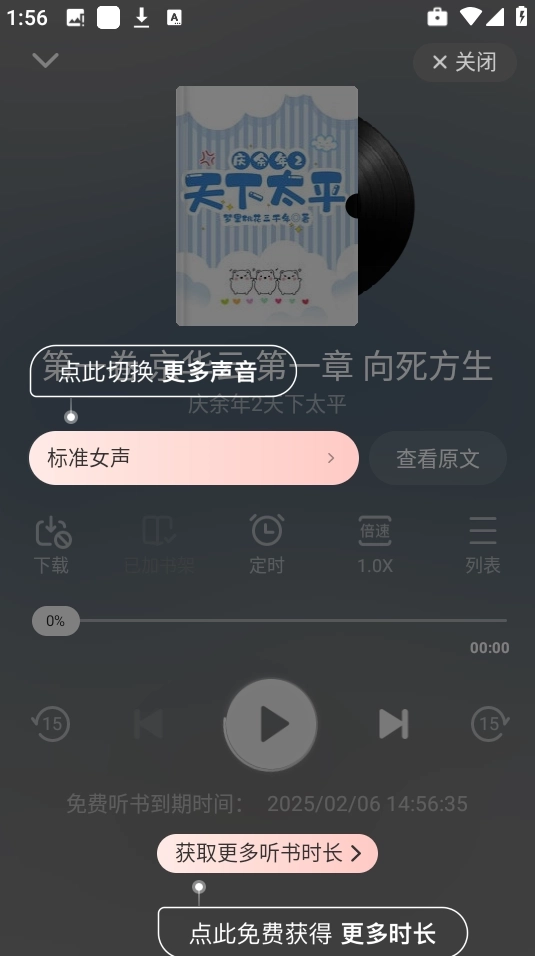 2、在阅读页面的下方找到“免费听书”选项,点击该选项即可进入播放界面。