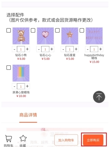 2、挑选这款蛋糕所需搭配的配件与属性,点击立即购买按钮;