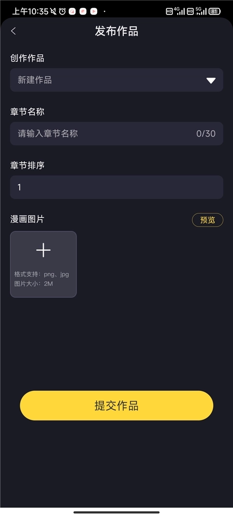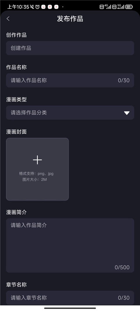 3、填写作品名称、漫画类型、漫画封面、简介等相关信息。