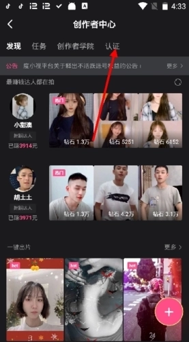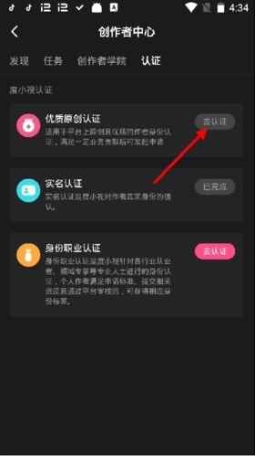 1、进入创作者中心后,点击上方的“认证”,在认证页面,再点击优质原创认证旁边的“去认证”;