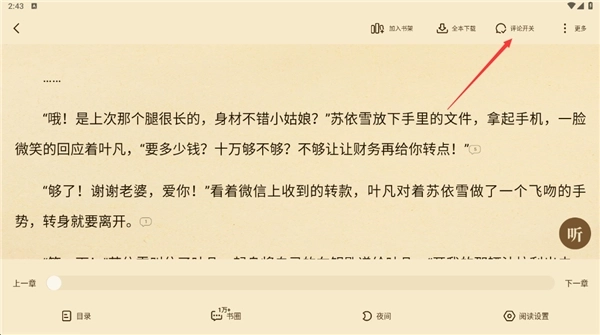 2、把下面的功能栏滑到最右端,点击章末推荐的开关按钮,就能开启这个功能啦