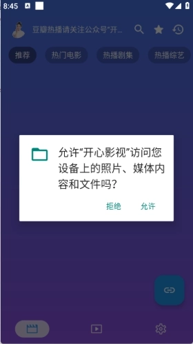 1、打开开心影视选择“允许”进入首页。