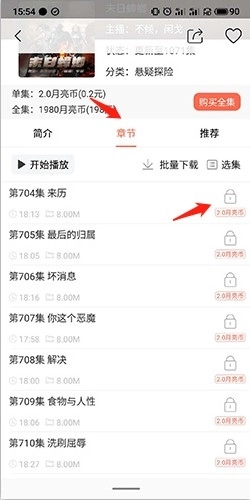 2、点击“章节”选项,挑选想要购买的章节,接着点击“解锁”按钮即可。