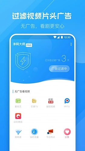 净网大师Pro是上海微栈网络科技有限公司开发的一款广告过滤拦截工具。你在追剧时是否总被广告打扰?那些烦人的弹窗广告是不是很影响观影感受?要是你有这种烦恼,不妨试试净网大师,它能支持爱奇艺、优酷、芒果等主流影视平台的广告过滤,还配备了新手教程,能帮你快速掌握使用方法,让你拥有更清爽的观影环境。