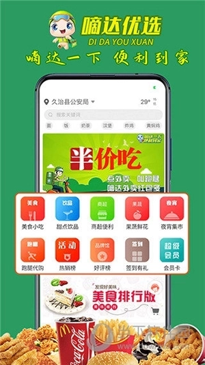 1、在本站安装并打开嘀达外卖,进入软件,首页为用户提供了格华止能够美食小吃,甜点饮品,商超便利等。