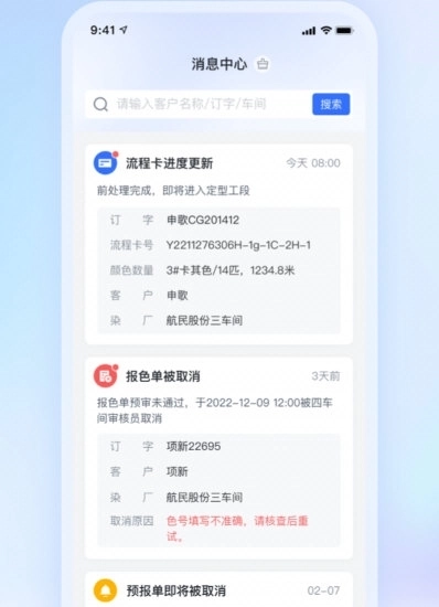 5、用户也可以对自己的消息中心进行查看,掌握染布的进度,轻松掌握重要信息。