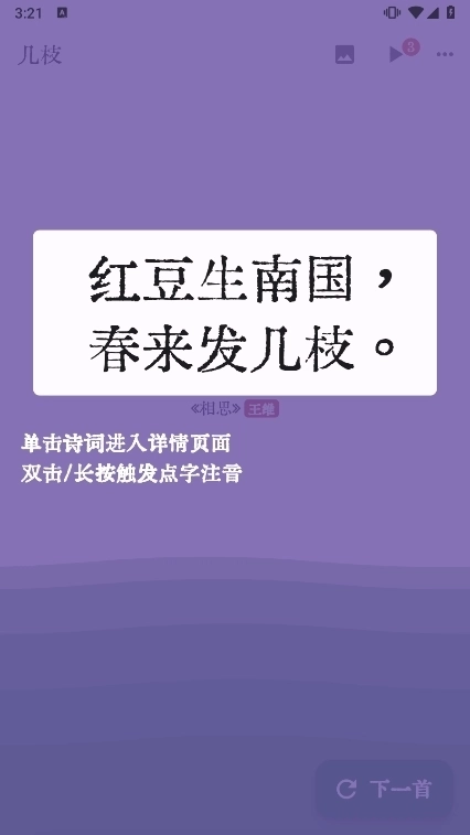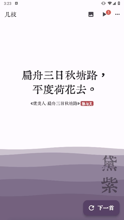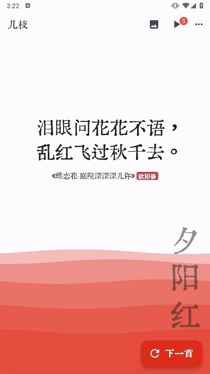 几枝是一款非常清新的古诗词鉴赏应用,它里面的个性化波浪诗词功能,每次刷新我们会智能推荐你一句诗词,还能根据你所在的位置,提供天气或者事件,每次刷新波浪会随机染上一个中国色,像面朝着大海,希望你沉浸此刻,这些你都可以通过右上角菜单进行保存,可用来分享给朋友,也可以用做壁纸,个性化你的手机。