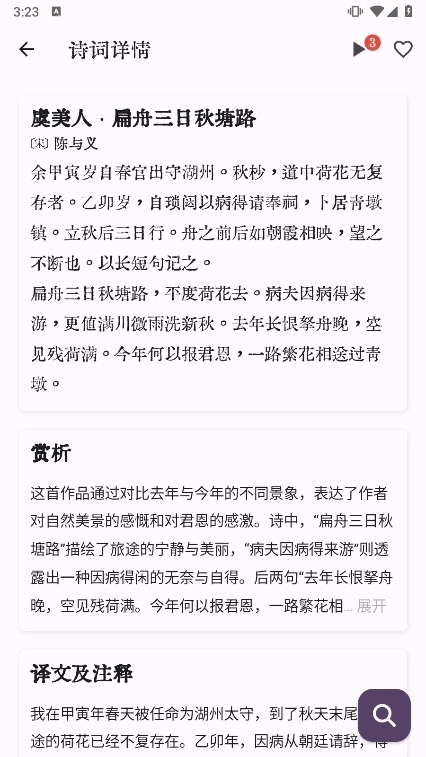 我对几枝这款手机应用进行了全面评测。几枝是一款非常特别的应用,以其独特的功能和风格而闻名。通过几枝,我可以轻松地阅读古诗词,并且可以自动更新内容,保持新鲜感。这对我来说非常有意义,因为我对诗词歌赋有着浓厚的兴趣。与以往的类似应用不同,几枝以其简约而精致的页面设计和极致轻简的画面效果脱颖而出。