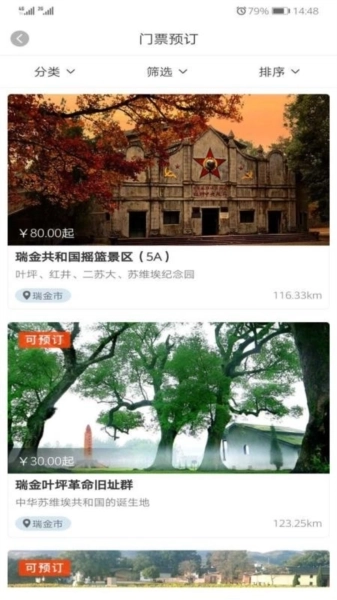 2、提供海量的景区景点,可以从分类和排序来筛选不同的景区,在线购票;