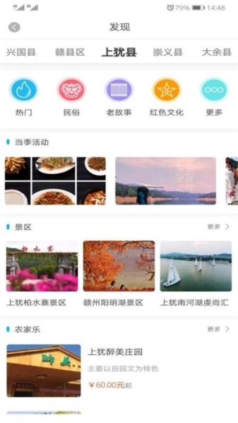 3、进入发现页面,了解不同县区提供的活动、农家乐和景区的信息