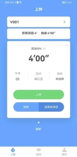 1、技师上钟、下钟操作;为顾客办理加钟、加项目服务;接待人员可查看房间状态、为顾客增加项目;员工能查看个人业绩数据;