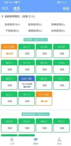3、对员工的上下班情况进行管理,管理人员可通过点击对应的班次或已排好的班表,查看工作人员的出勤情况,其中涵盖空闲技师、轮钟技师、停牌技师、下班技师等不同员工类别,同时也能够对他们的上下班进行安排。