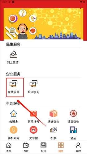 2、然后选择“服务”中的“在线答题”即可