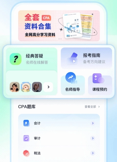 揽星会计CPA手机版是一款专注于注册会计师考试备考的移动端学习工具,覆盖会计、审计、税法、经济法、财务成本管理、公司战略与风险管理六门核心科目。软件以专业、全面、实用为开发理念,整合了题库练习、视频课程、学习资料、答疑互动四大核心模块,形成学-练-测-问闭环学习体系。无论是零基础入门的新人,还是冲刺提分的老考生,均可通过实现个性化学习路径规划,高效利用碎片化时间完成备考目标。