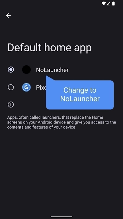 在默认应用中将主屏幕应用选择NoLauncher即可。