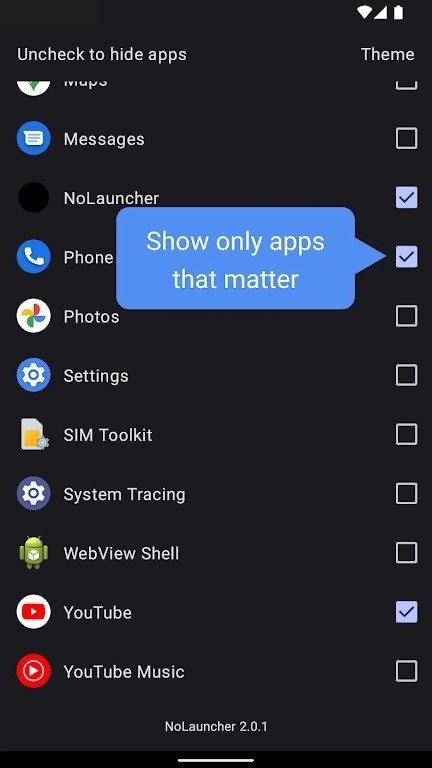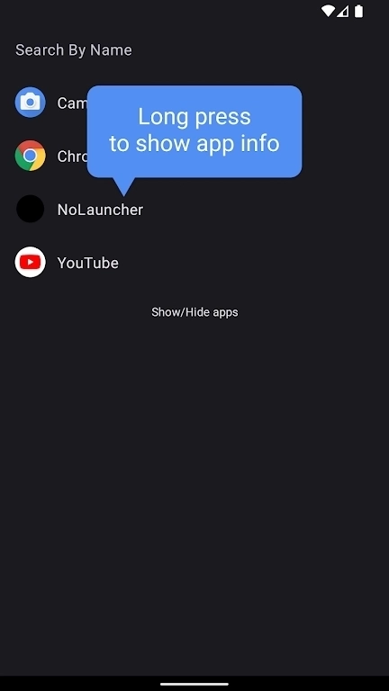 NoLauncher是安卓系统上的一款精简启动器,仅仅只有21kb的安装包,没有任何广告和权限,这个启动器仅仅只有一个应用列表,你手机上的所有应用都会显示在列表中,你可以搜索列表中的应用,也可以隐藏应用,真的没有其他启动器比这个更精简了,很适合老的安卓机型使用。