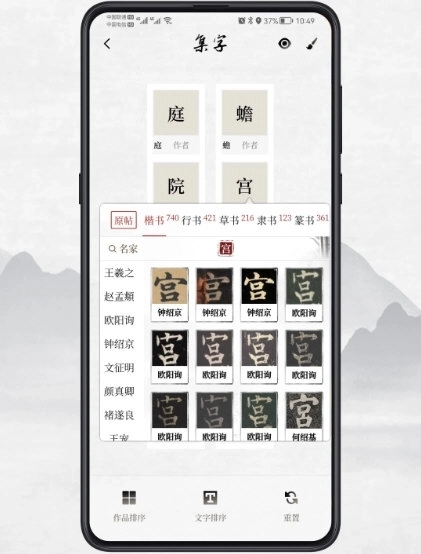 【集字】支持自定义内容,可从书法字典进行查询集字,支持上百个字进行集字,还能预览、导出图片并分享,有助于用户研究字形结构和笔画顺序,提高书法创作能力。