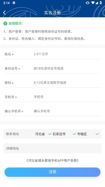 1.3、鉴于“河北省城乡居民基本养老保险”帐号的绑定注册方式,您同意河北省城乡居民基本养老保险在注册时将使用您提供的手机号码、身份证号码、姓名、社保卡号及自动提取您的手机设备识别码等信息用于注册。