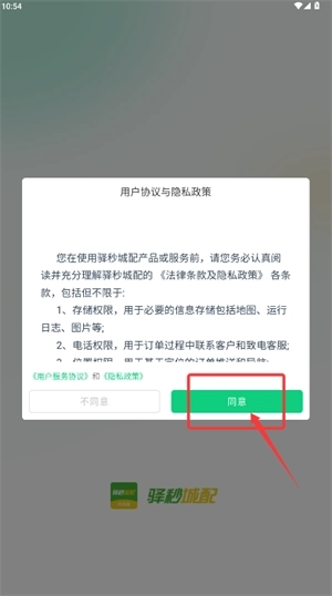 1、启动驿秒城配应用,在协议弹窗中点选“同意”完成授权。