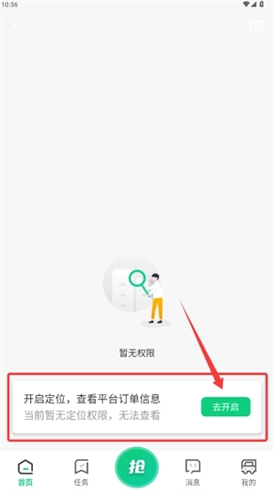 3、进入首页后点击去开启,可授予定位权限以便查看订单信息。