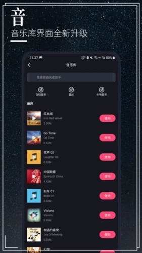 [素材中心]:丰富多样的贴纸、字幕字体与样式、视频海报,以及各类背景音乐可供使用。