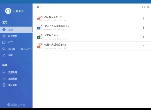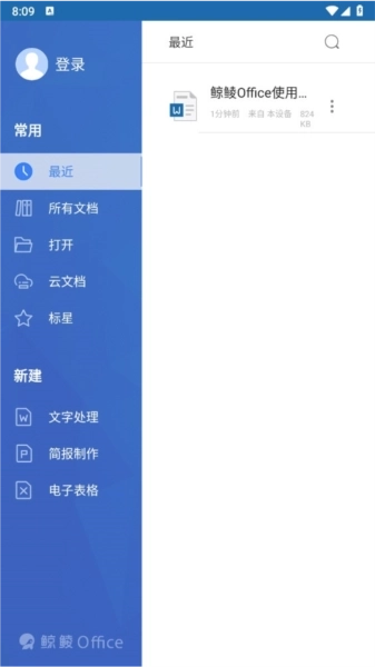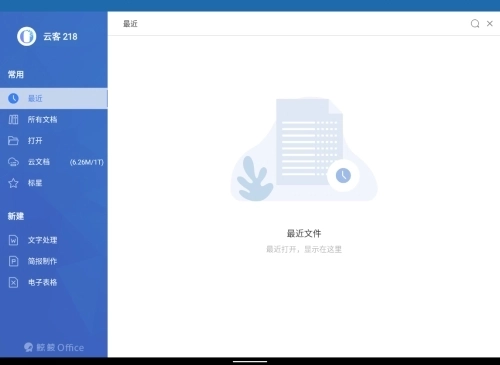进入鲸鲮Office后,默认进入最近页面,最近页面中会展示近期打开过的文档(本地文档及云文档)。