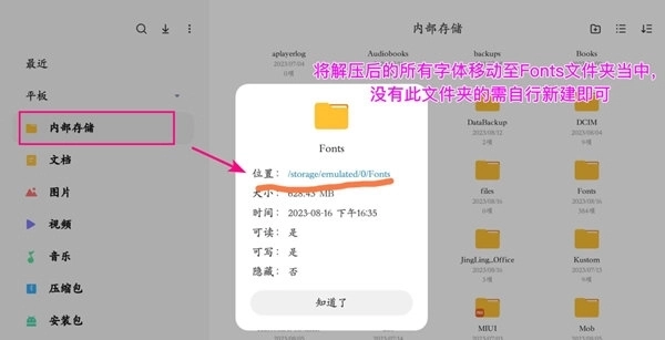 1、/storage/emulated/0/Fonts:后解压的ttf文件放入存储目录Fonts文件夹(没有的自建一个),无法显示的卸载后重新安装应用。若字体格式下拉列表全为英文,请·转至附件。