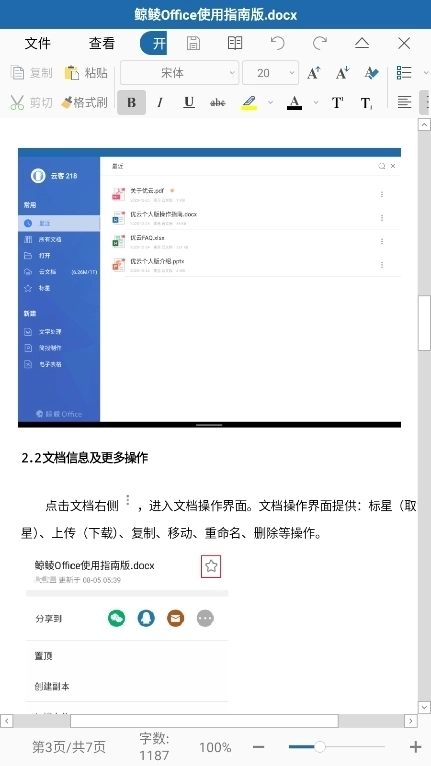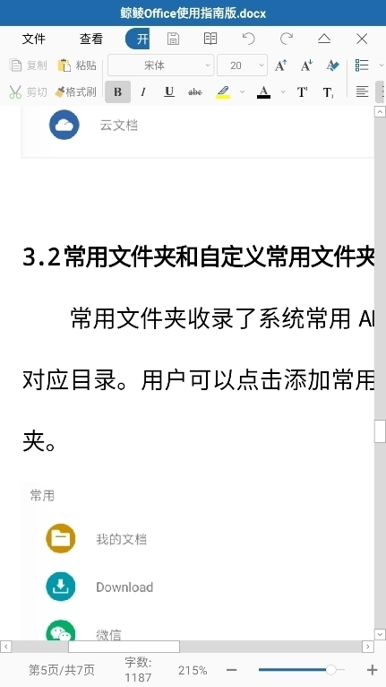 鲸鲮Office是一款基于永中Office定制底层技术而开发的手机端办公应用,集文字处理、电子表格、简报制作和PDF阅读及在线转换于一体,能够提升移动办公效率,是便捷高效的智能移动办公助手。鲸鲮最大的亮点特色就是它能够让你在手机端体验到PC级Office的UI界面,电脑上的Office功能它上面基本都有,比如文字处理(Word)支持常用文本编辑功能,同时支持图片等对象的插入和操作,完全满足日常办公的需求。而且操作和电脑端大同小异,也适用于手机和平板端使用。鲸鲮Office还支持账户、云文档、模板,能够和WPS手机端互联互通,并与永中旗下其他产品深度融合,完美兼容全部微软97-16版文档格式,与桌面无缝衔接,有需要的可以来使用。