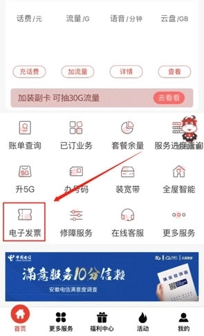 一、打开安徽电信,在首页点击【充话费】或【加流量】即可进行充值
