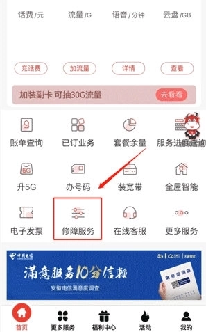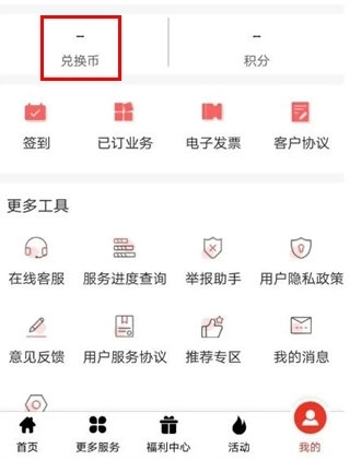 一、打开安徽电信进入【我的页面】,点击【兑换币】