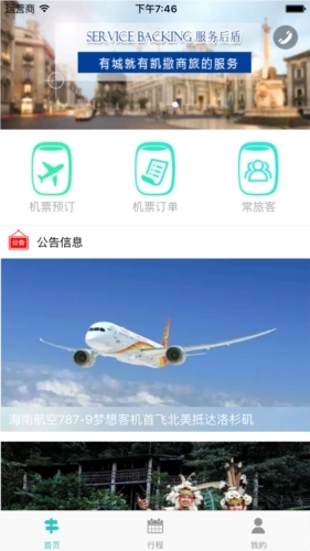 首页设有三个便捷的管理服务专区,分别对应机票预订、机票订单和常旅客设置功能。