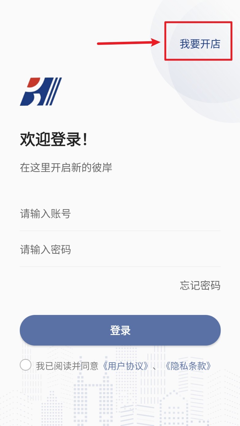1. 打开App,点击右上角的「我要开店」,随即启动商家注册流程,进入入驻页面。