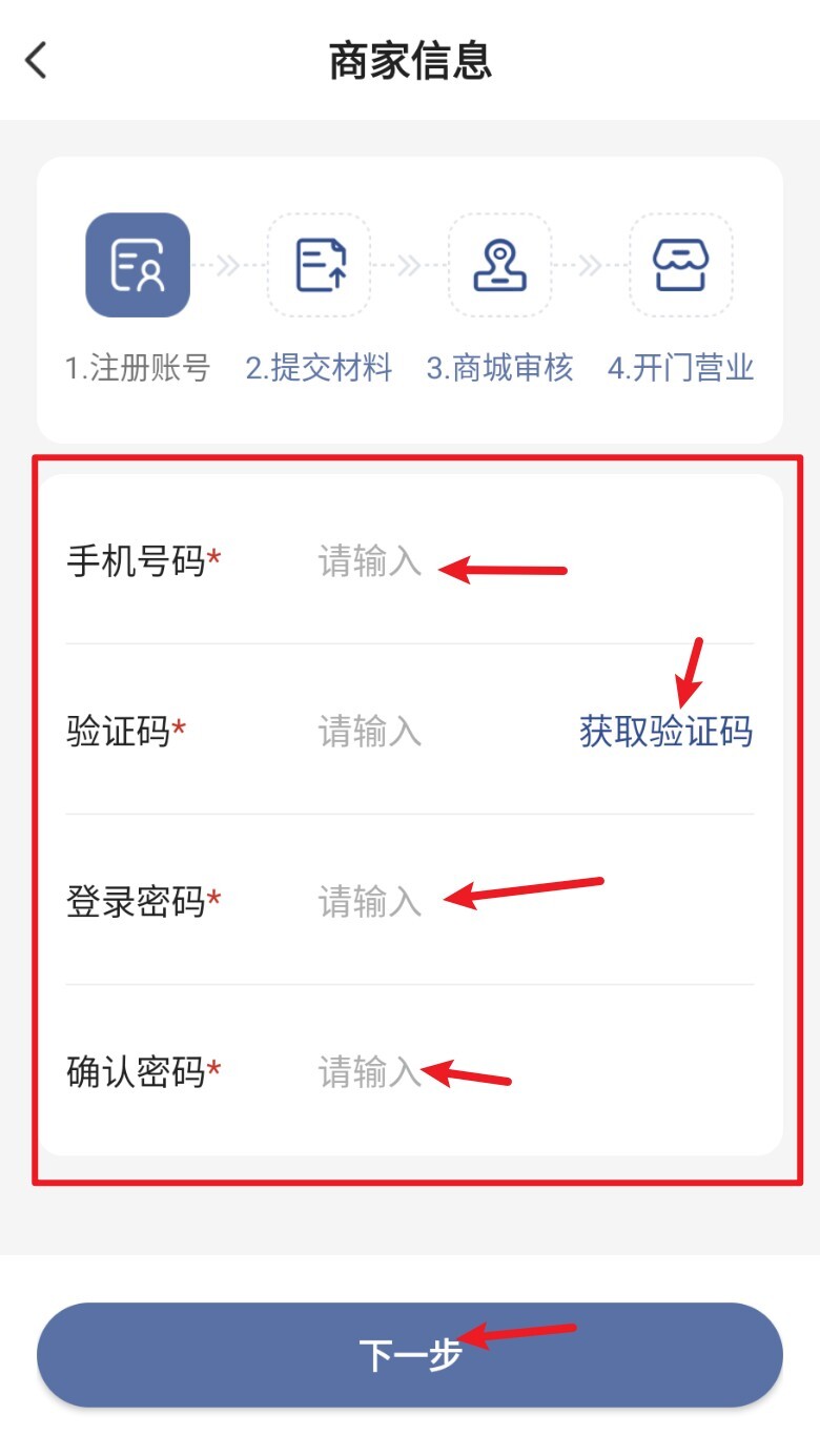 3. 依次输入手机号、验证码,并设置登录密码,随后点击「下一步」,即可完成账户创建流程。